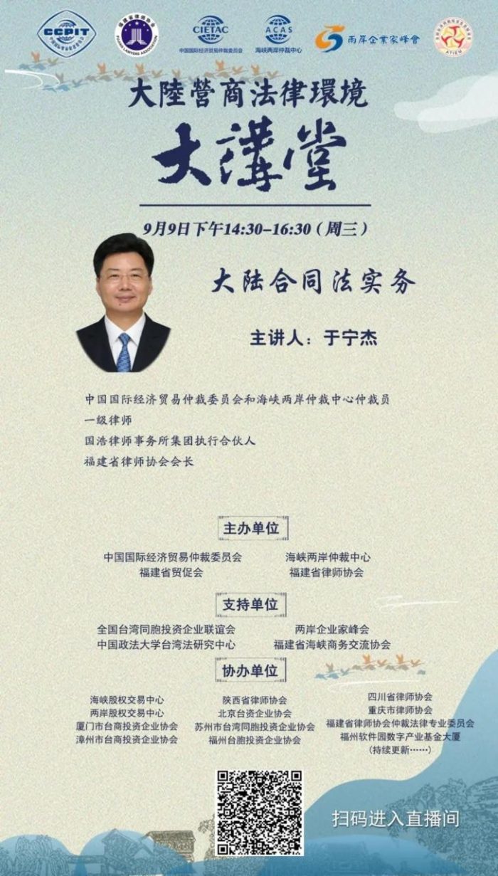 “大陸營商法律環(huán)境大講堂”預告丨省律協(xié)會長于寧杰:大陸合同法實務 福州律師資訊發(fā)布者 福州律師網(wǎng)2020年9月7日為便利臺商臺企在大陸投資興業(yè),中國國際經(jīng)濟貿易仲裁委員會、海峽兩岸仲裁中心、福建貿促會、福建省律師協(xié)會等單位聯(lián)合舉辦“大詳情