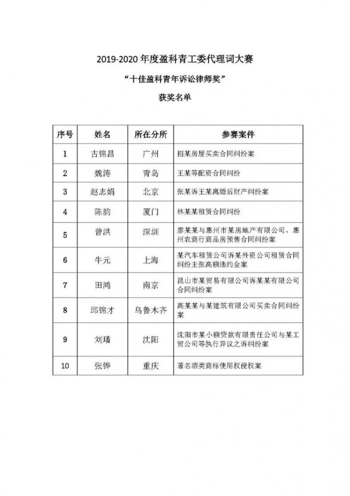 盈科福州律所五位律師上榜!”2019–2020年度盈科全國青工委代理詞大賽”獲獎名單新鮮出爐啦! 福州律師資訊發布者 福州律師網2020年7月24日青年興,盈科興!為深入學習貫徹習近平總書記對律師工作的重要指示精神,提升盈科全國青年律師業務技能水平、鍛煉思辨能力,盈科詳情